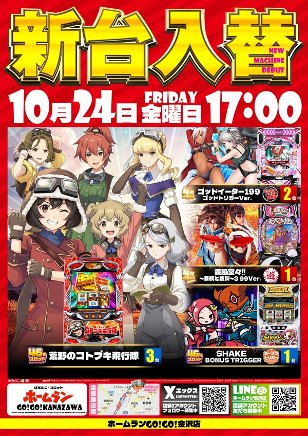 ホームランGOGO金沢店>10月24日(月)新台入替 17時開店