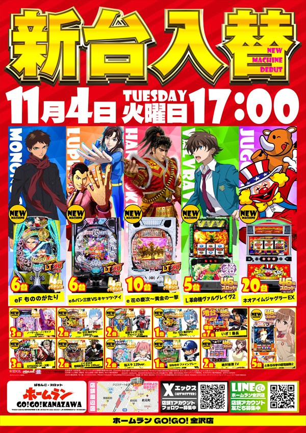 ホームランGOGO金沢店>11月4日(月)新台入替 17時開店