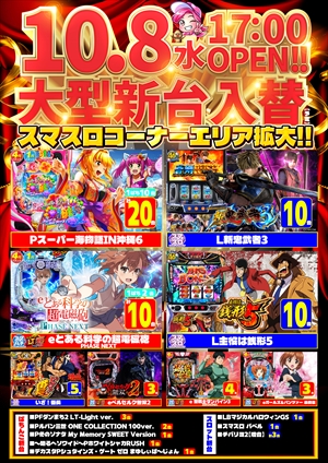 ホームランGOGO野々市店>10月8日(水) 新台入替 17時開店